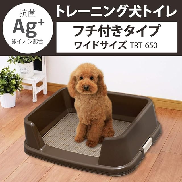 【トレーニングに最適なトイレ】:トイレを覚えやすい囲い付きタイプのペットトイレ。ふちが高いのでおしっこの飛び散り防止にも効果的。