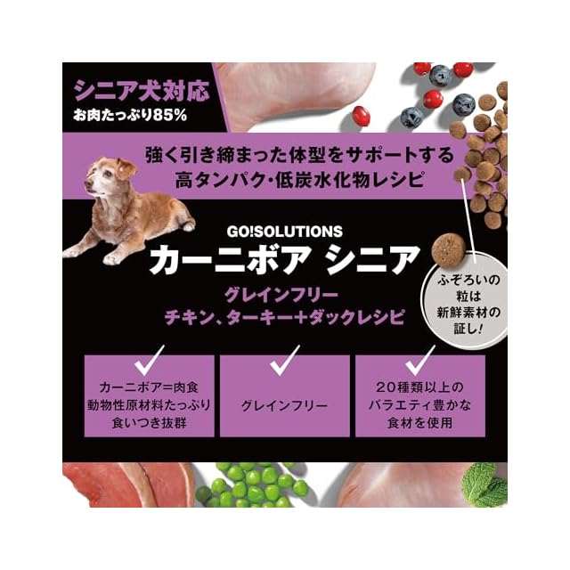 【厳選した食材で、美味しくお悩みを解決】20年以上のペット栄養の専門知識と厳選した安心食材。美味しく健康的にお悩みを解決する最適なレシピ。それがGO!SOLUTIONです。<BR>【お肉たっぷりの高タンパク・低糖質フード】タンパク質の85%が動物性原材料を使用。チキン・ターキー・ダックなど7種類のお肉、お魚でシニア犬の健康に。お肉が好き、関節ケアが気になる、筋肉を維持して引き締まった体型を目指したい、多彩な食材から栄養を取りたい、そんなお悩みに。<BR>【栄養や消化に考慮したフルーツ・野菜・ハーブも充実】免疫機能をサポートする20種類のフルーツの組み合わせで美味しさと栄養バランスを整えることを目指しています。更に健康な腸内環境と良好な消化をサポートするプロ・プレバイオティクス、14種類のハーブを配合。<BR>【安心・安全の厳選レシピ】グレインフリー、グルテンフリー、副産物・人工添加物(合成保存料・香料・着色料)不使用。<BR>【シニア/体重管理用・レギュラー粒タイプ】グルコサミン+コンドロイチン配合で関節をサポート。よく噛んで食べられる丸形のレギュラー粒タイプ(約10-13mm)です。*新鮮素材を使用しているため、季節によって粒の形・大きさにばらつきがあります。