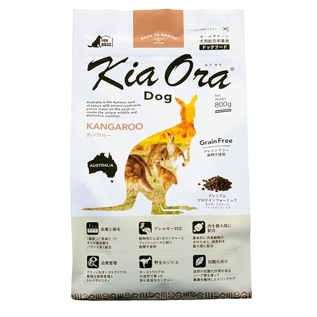 肉食獣である犬のために、肉原料を最大限に配合、植物原料は最小限の種類と量に絞り、消化・皮膚・被毛・おいしさ・免疫力・便のヘルスケアを追求したフードです。限りなく広大な自然が続くオーストラリアは、野生動物が豊かに育つ世界有数の自然大国です。 年間を通じて太陽と雨に恵まれ、自然の草を食べてのびのびと育ったカンガルーは、オーストラリア特有のジビエで高たんぱく、低脂肪、低コレステロールのヘルシーなお肉です。Kia Oraが使用するカンガルーは、体にやさしい赤身の健康食肉で、ルーミートと呼ばれ、最近ではベニソンに代わる新奇たんぱく源として注目されています。/成分値:たんぱく質 29.0%以上、脂質 17.0%以上、粗繊維 4.0%以下、灰分 10.0%以下、水分 10.0%以下/総合栄養食:本品は、ペットフード公正取引協議会が定める分析試験により、幼犬、成長期の犬、妊娠犬・授乳犬などの全ライフステージに適したバランスの良い総合栄養食の基準を満たすことが証明されています。/AAFCO栄養基準:本品は、AAFCO(米国飼料検査官協会)規定の分析試験により、幼犬、成長期の犬、妊娠犬・授乳犬の健康維持に適したバランスの良い総合栄養食であることが証明されています。/保存方法:常温で安定した製品のため、冷蔵庫に入れる必要はありません。直射日光の当たらない、湿気の少ない涼しいところで保管してください。また、開封後はしっかりと密封して、約1か月程度で使い切っていただくことをお奨めします。/与え方・切り替え方:給与量は体重を元に計算を行ってください。パッケージに1日の給与量のめやすを掲載しています。フードを切り替える時は、一度に切り替えるのではなく、今まで与えていたフードに対して、Kia Oraの割合を少しずつ増やしながら、数日かけて切り替えてください。/「キアオラ」は、天然の生肉を使用しておりますので、原材料の産地や収穫時期により、粒の見た目や大きさに若干差がある場合がありますが、品質上問題はありません。/肉原料を最大限配合し、でんぷん原料を最小限に配合のためぬるま湯でふやけにくいです!/肉食動物の食事に近づけるため、ミネラルの一部として 骨をすりつぶして配合しているため、すりつぶしきれない小さな骨粉が粒の表面に出ているものがあります!