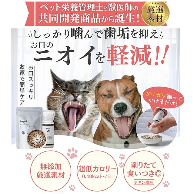 【美味しさと安心を両立】チキン味で美味しく、削りたてのふりかけ粉末が犬猫を魅了します。食べ過ぎ注意!でも1日0.48kcalの超低カロリーだから安心。もちろん毎日食べるものだから、人と同じ基準の原材料・製造品質で無添加にも配慮しています。犬歯磨き・猫歯磨きアイテムをお探しの方に、ぜひ試していただきたい「お口のふりかけ」です。