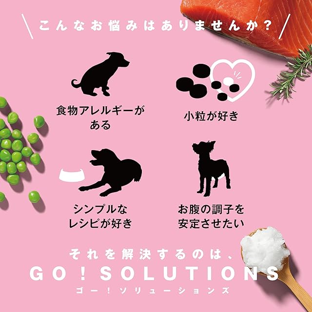 【厳選した食材で、美味しくお悩みを解決】20年以上のペット栄養の専門知識と厳選した安心食材美味しく健康的にお悩みを解決する最適なレシピそれがGO!SOLUTIONです【食物アレルギー対応食/シンプルレシピ】センシティブシリーズは、食物アレルギーを持つ敏感な愛犬をサポートするために特別に設計されたレシピです食物アレルギー、皮膚や被毛、お腹の調子、味の好みなどのお悩みに【LID グレインフリー サーモンレシピ】高品質なサーモンを唯一の動物性タンパク質として使用し、メインのタンパク質以外の食材もできる限り厳選タピオカ、えんどう豆、レンズ豆、ヒヨコ豆とヘルシーな低GI食材のみを採用【安心・安全の厳選レシピ】グレインフリー、グルテンフリー、ポテトフリー、副産物・チキン・人工添加物(合成保存料・香料・着色料)不使用【全年齢対応・小粒タイプ】全年齢対応で、お口の小さい小型犬も食べやすい小粒タイプです*新鮮素材を使用しているため、季節によって粒の形・大きさにばらつきがあります