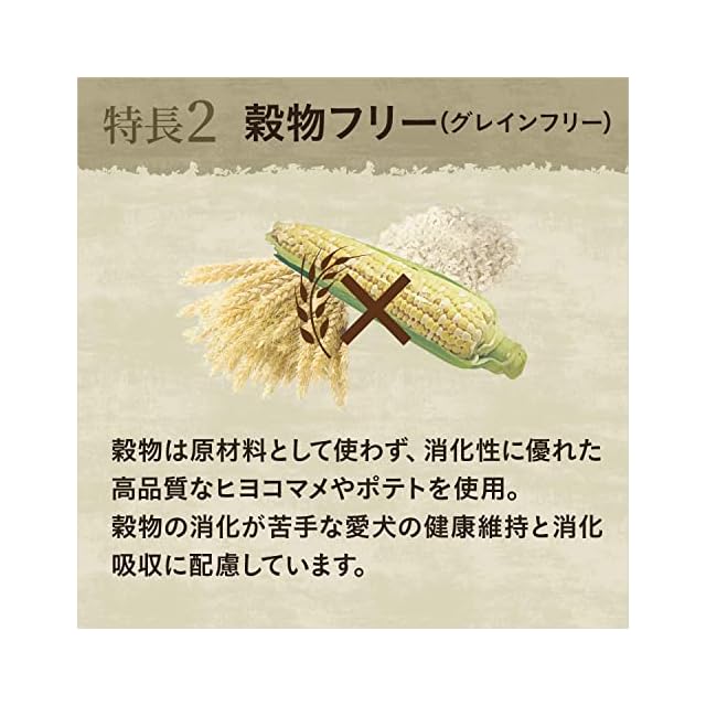 穀物は原材料として使わず、消化性に優れた高品質なヒヨコマメやポテトを使用。穀物の消化が苦手な愛犬の健康維持と消化吸収に配慮しています。