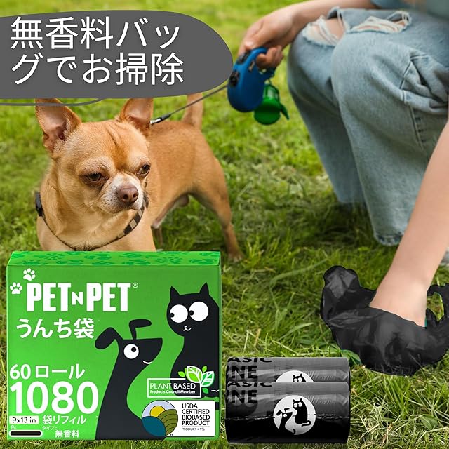 Pet N Pet うんち袋、エチケット袋、60ロール入り1080個、臭わない犬のうんち袋、犬の散歩用猫用トイレ袋、USDA認定 38% 植物由来 & 62% PE、漏れ防止で丈夫