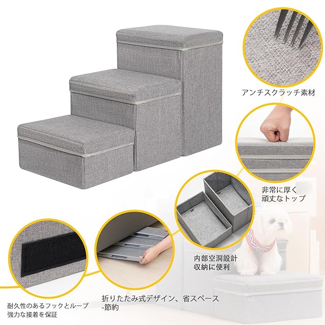 商品名:Uross 犬用階段 収納付き 3段 小型犬用 中型犬用 大型犬用 ペット用階段 ベッド用 耐荷重約30kg 老犬 猫用 犬 子犬用 階段 ソファー用ステップ (ライトグレー)