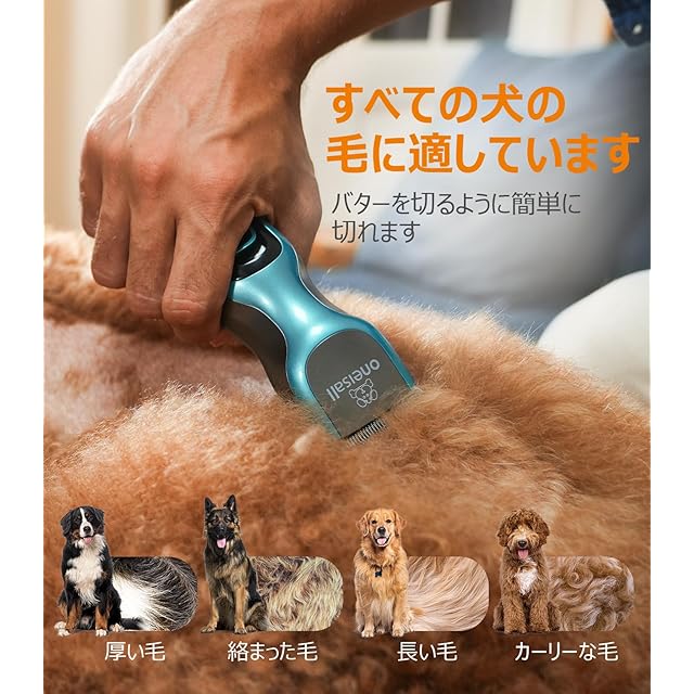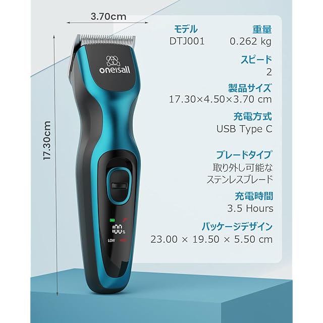 商品名:oneisall 犬用バリカン 低振動・低騒音 ペット用バリカン プロ用 初心者用 安全設計 LEDディスプレー付き ハイパワー(7000RPM) 刈り高さ調整可能 厚い被毛/全身カット対応 大容量2000mAh 全犬種用 ペットクリッパー モデルDTJ-001(全身用サイズ)