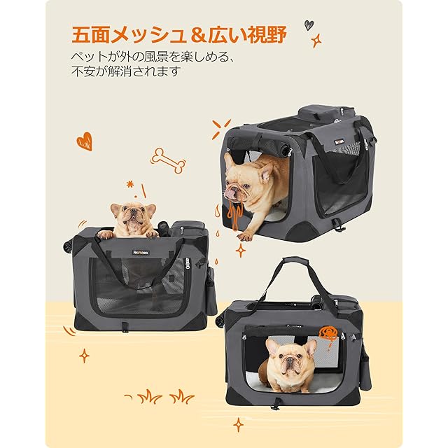 FEANDREA ペットキャリー 折りたたむ 変形しない犬用キャリー 4面メッシュ 60×42×42cm グレー PDC60GY