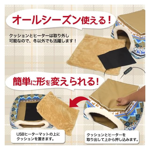 ■USBヒーターマット付きあったかペットハウス!<br> 寒い時期にぴったり!ペットが長時間リラックスできる、ちょうどいい温度のUSBヒーター付きペットハウス。<br> 体を覆うハウス型で中の温かさを保ちつつ、わんちゃん・ねこちゃんを優しく包み込みます。<br><br> ■低消費電力で経済的<br> 1日(8時間)使用で約1円の低消費電力タイプ<br> ※電気料金1kwh=27円の場合。使用環境や電力会社・契約内容によって異なります。<br><br> ■中間スイッチ!コードが邪魔にならない<br> 便利な中間スイッチ付き!ON/OFFも簡単です。<br> また、背面にコード通し穴が付いているので、コードが邪魔にならずに安心。<br><br> ■便利なUSB給電式<br> USB給電式なので、モバイルバッテリーでも使用可能!電源がないアウトドアでも活躍します。<br><br> ■好みに合わせて形を変えられる2WAYタイプ<br> わんちゃんねこちゃんの好みに合わせて「ハウス型」と「ベッド型」どちらのタイプもお試しいただけます。<br><br> ■オールシーズン使える<br> クッションとヒーターは取り外し可能なので、冬以外でも活躍します<br><br> ■ピンクとブルーの2色展開<br> ピンクとブルーの2色からお選び頂けます。