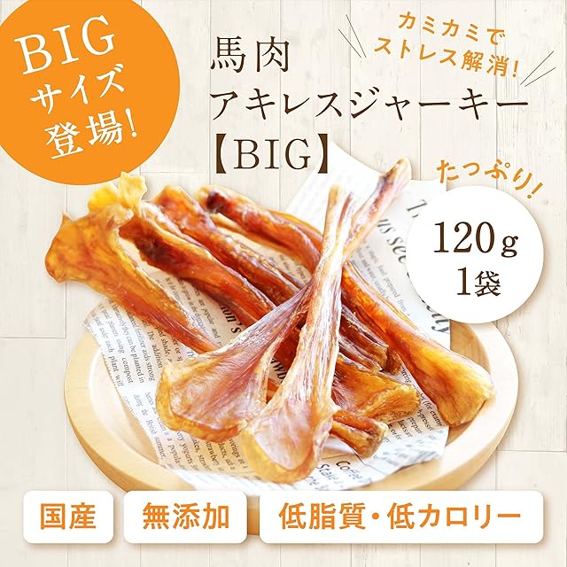 #5 \大容量!通常より3.5倍!アレルギー持ちのワンちゃんも安心でかみかみ!/ たっぷりの120gが入りました!通常容量(アキレスジャーキーは35g/袋)よりおよそ3.5倍!じっ〜くりかみかみができる!添加物不使用のグルテンフリー、さらに牛肉と鶏肉成分も使用せず、低アレルゲンと言われる馬肉アキレス腱100%!アレルギー持ちのワンちゃんも安心してかみかみできます!【注意点】のどに詰まらせないように、飼い主様が手で持って与えるか、柔らかくなるまで噛んでいることを確認し、お与えください。【生後6ヶ月から】歯が生えそろった生後6ヶ月以上からお与えください。キッチンバサミでも切ることがで難しい硬さです。
