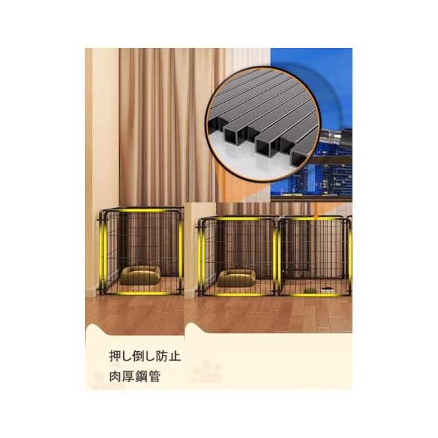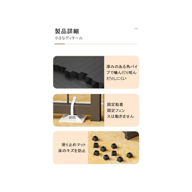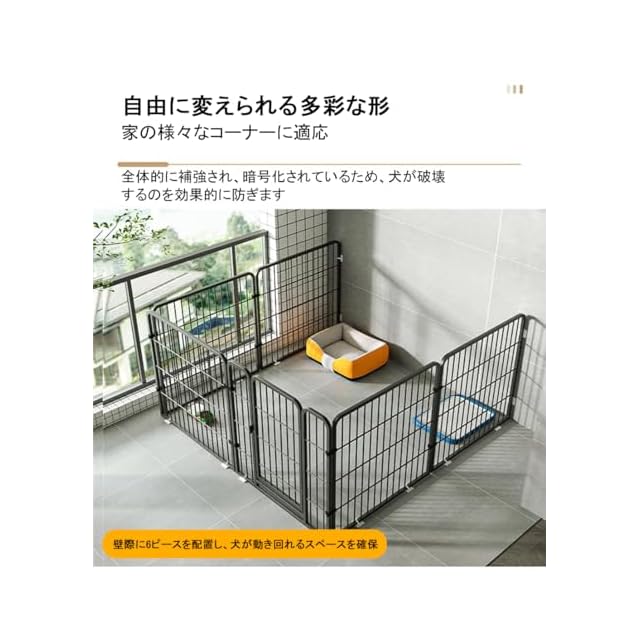【形を自由にレイアウト・立派な拡張性】 本ペットフェンスは、6枚個別の60幅のメタルパネルを組み合わせて構成されます。 幼犬、小型のペット、 ハムスター、うさぎ、モルモット、フェレットなどの小動物に最適です。 成長途中のワンちゃんを飼育している方や、将来的に数が増える予定なら、拡張性に優れているものが便利です。ペットフェンス自体の形を変えたり、別売りのパーツを追加して拡張できるものなら、ワンちゃんの活動スペースを広げることができ、お部屋の広さにも合わせやすいですよ.