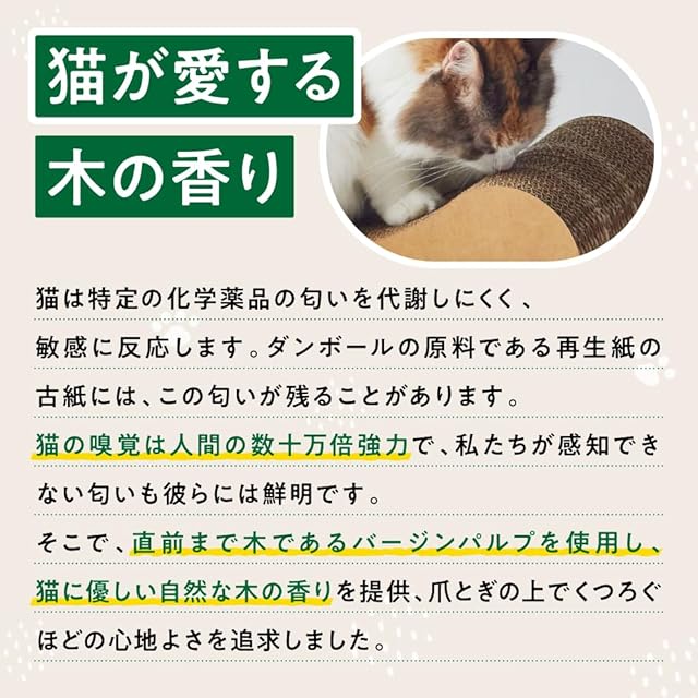 ⬛⦅純日本製で大切な猫ちゃんにも安心⦆ニャンズの 爪研ぎ は、直前まで木のバージンパルプを使用することで、猫ちゃんの本能が喜ぶ「木の香り」を実現。純日本製の強化ダンボールを1枚1枚手張りしながら制作しており、大切な猫ちゃんにも安心してご使用いただけます。