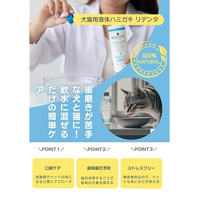 歯のブラッシングが苦手な犬猫用の液体ハミガキが誕生。 とっても簡単!ペットの飲水に混ぜるだけ!口臭・歯石・歯垢をケアし、口内環境を整えます。
