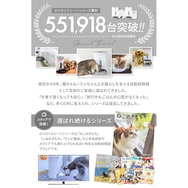 【シリーズ累計55万台突破】 実績と信頼の自動給餌器シリーズ「カリカリマシーン」から新しくエントリーモデルとして誕生しました。猫ちゃん・ワンちゃんの健康を守るため、はじめての飼い主さんにも安心して選ばれています。