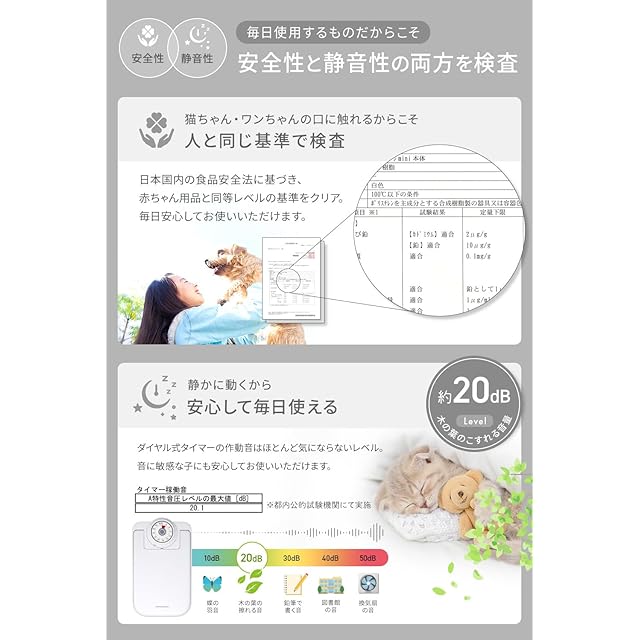 【静音設計 約20dB】 タイマー作動音は木の葉のこすれる音ほどの静かさ。音に敏感な猫ちゃんやワンちゃんも怖がらず、夜間や就寝中でも安心です。