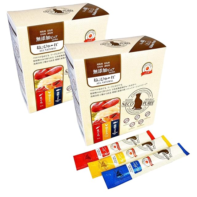 無添加ピュアシリーズ3種(鶏ささみ、まぐろ、海鮮ミックス)各20本ずつが1箱になったお得なパック<br> ペロペロなめても、フードにかけても。<br> 安心安全日本産ピューレタイプ。 <br>愛猫と家族の絆 コミュニケーショントリーツ。 <br><br>~こだわりバリューポイント~ <br>5つのNo<br> ●No増粘剤<br>●No着色料 <br> ●Noグルテン<br> ●No甘味料<br> ●No調味料<br> <br>添加物不使用。<br>余計なものを使わずピュア素材だけをギュッと凝縮。<br>3ヵ月未満の幼猫は消化器官が未発達のため、与えないでください。<br><br>〈原材料〉<br>【まぐろ】まぐろ、米粉 <br>【鶏ささみ】鶏ささみ、米粉<br>【海鮮ミックス】魚介類(まぐろ、かつお、サーモン、しらす)、米粉<br><br>〈成分〉<br>【まぐろ】たんぱく質:7.5%以上、脂質:0.1%以上、粗繊維:0.5%以下、灰分:1.0%以下、水分:90.5%以下、エネルギー(1本あたり)約8kcal<br>【鶏ささみ】たんぱく質:8.0%以上、脂質:0.1%以上、粗繊維:0.5%以下、灰分:1.0%以下、水分:88.0%以下、エネルギー(1本あたり)約7kcal<br>【海鮮ミックス】たんぱく質:6.0%以上、脂質:0.5%以上、粗繊維:0.5%以下、灰分:1.5%以下、水分:87.0%以下、エネルギー(1本あたり)約8kcal<br>〈内容量(1本あたり)〉<br>13g