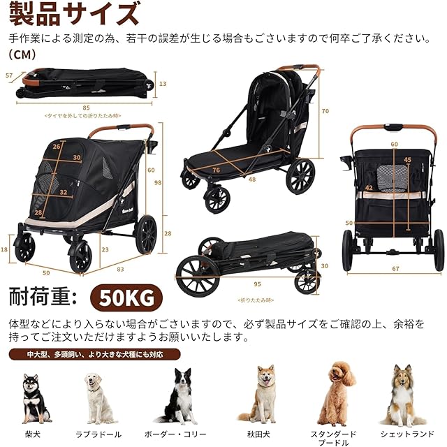 【商品仕様】大型犬 カート展開サイズ(約):長83cm x 前幅50cm/後幅67cm x 高さ98cm 収納サイズ(約):長さ95cmx幅67cmx高さ30cm(折りたたみ方法②で僅か13cm) 本体フレーム:合金鋼 生地:600D防水オックスフォード布 車輪直径:前輪18cm、後輪28cm 車輪素材:EVA+PU 本体重量(約):9.3KG 耐荷重(約)50KG 中大型・多頭飼い・老犬介護向け 合金鋼スチール製フレームと丈夫な生地で作られた一品です。別売りの防水カバーもご用意しております。商品をお探しの場合は、B0D8SVBPCFで検索し、ぜひご確認とご購入をお願いいたします。【製品】:製品はご購入日から12ヶ月間が付属します。製品は万全を期して製造しておりますが、万が一不良品が届いた場合もしく使用時に不備な点がございましたら、お気軽にご連絡ください。誠心誠意お客様にサービスを致します。