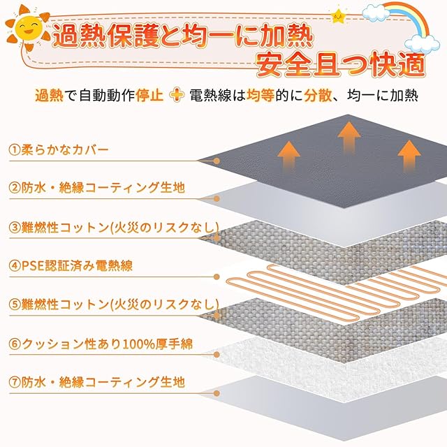【過熱保護・防水難燃・厚手・省エネ】温度センサーを内蔵し、過熱や漏電などの異常が発生した場合は自動的に電源が切れます、ペットの安全を確保します。ご安心に使用ください。このヒーターは、厚手のスポンジと難燃性のコットンを内部に豊富に使用しており、表面には防水難燃性の人造皮革を採用しています。柔軟性と快適性を確保すると同時に、安全性も確保されています。一時間あたりの消費電力35ワット/電気代0.5円、省エネで長い時間につけっぱなしでも大丈夫です。