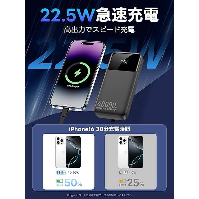商品名:モバイルバッテリー 大容量【40000mAh・5台同時充電・22.5W急速充電】モバイルバッテリー 軽量 小型 スマホ充電器 携帯充電器 LCDディスプレイ残量表示 Type-C入出力兼用 2USB出力ポート 最大3A出力 PSE認証済 安全設計&回路保護 iOS/Android各種スマホ対応 アウトドア/キャンプ旅行/出張/停電対策/防災