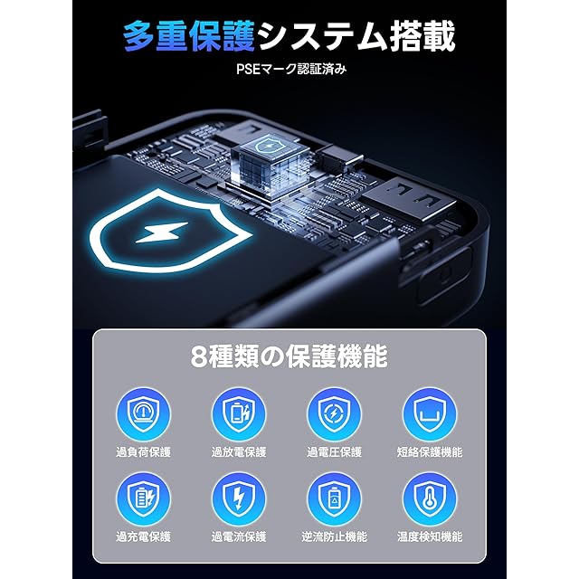 【8つの保護機能搭載・PSE認証取得済】高品質と安心を、この1台で!✅ 大容量モバイルバッテリー は、日本の電気用品安全法(PSE認証)に合格した信頼性抜群の高品質バッテリーです。独自の保護機能パッケージを採用し、過負荷・過充電・過放電・過電流・過電圧・逆流防止・短絡保護・温度検知の8つの保護機能を搭載。あらゆるリスクからデバイスを守り、安心してご利用いただけます。さらに、充電サイクル1000回以上を実現する長寿命設計で、劣化を気にせず長期間お使いいただけます。回路構成の最適化による高効率充電で、必要なときにしっかりパワーを供給。災害時やアウトドアでも非常用電源として大活躍します。