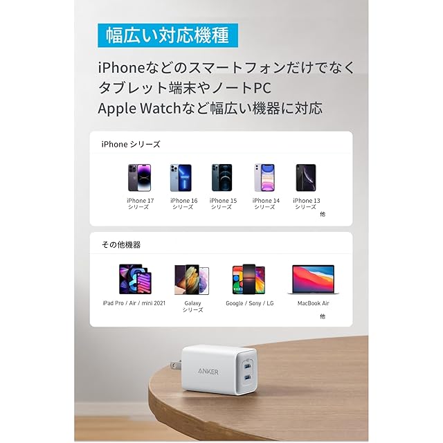 幅広い対応機種:iPhoneなどのスマートフォンだけでなく、タブレット端末やMacBook Airなどの幅広い機器に対応しています。