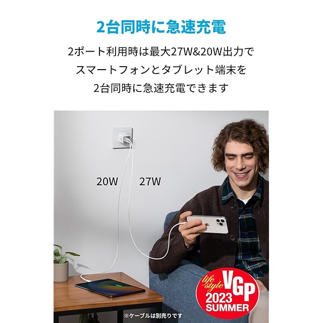 2台同時急速充電:USB PD対応の2つのポートを搭載し、2ポート利用時にも最大27W&20W出力が可能。スマートフォンやタブレットなど、2台のデバイスを同時に充電することができます。