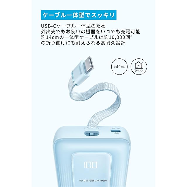ケーブル一体型で、荷物がスッキリ:USB-Cケーブル一体型のため、外出先でもお使いの機器をいつでも充電可能です。約14cmの一体型ケーブルは約10,000回の折り曲げにも耐えられる優れた耐久性を実現しました。(Anker調べ)