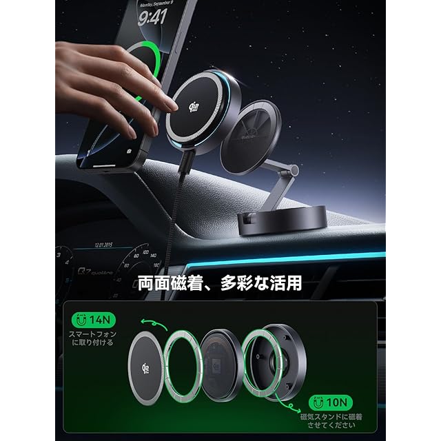 【両面マグネット · 多様なシーンで使用可能】THREEKEYのワイヤレスチャージャーは「両面マグネット設計」を採用しており、片面はマグネットで充電でき、もう一面はマグネットホルダーと組み合わせて多様なシーンで使用できます。たとえば、デスクのマグネットホルダーと組み合わせると、充電しながらビデオ通話や映画、テレビドラマを楽しむことができます。また、車載マグネットホルダーと組み合わせると、充電しながらナビゲーションが可能です。あなたにより便利で楽しいライフスタイルを体験してください。