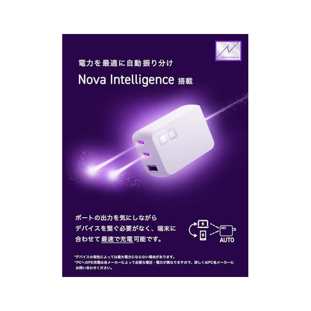 【電力を最適に振り分け NovaIntelligenceを搭載】接続された端末に合わせて電力を自動で調整する独自の技術 NovaIntelligence を搭載。ポートの出力を気にしながらデバイスを繋ぐ必要がなく、同時充電時もストレスなく快適に充電が可能です。