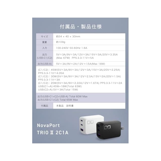 商品名:CIO NovaPort TRIOⅡ 65W USB-C ×2+A 急速充電器 [世界最小級 NovaIntelligence NovaEngine搭載] ACアダプター 3ポート 2C1A USB type-C×2 + type-A ノートPC 充電器 コンセント PD iPhone 17 / Air / 16 / 15 Android Galaxy Macbook iPad向け (ホワイト)