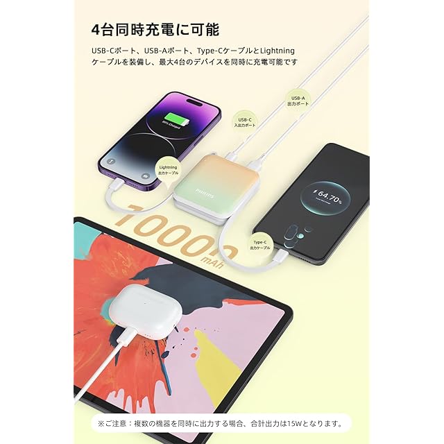 【4台同時充電&パススルー機能】 USB-Cポート、USB-Aポート、usb-cケーブルとlightningケーブルを装備し、最大4台のデバイスを同時に充電可能です。パススルー機能も搭載し、モバイルバッテリーとスマートフォンを同時に充電できます。※ご注意:複数の機器を同時に出力する場合、合計出力は15Wとなります。
