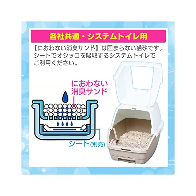 【商品説明】:クエン酸、ゼオライト、シリカゲルの3つの消臭素材でがっちり消臭。 固まらないタイプのシステムトイレ用猫砂です。 クエン酸がアンモニアを中和し、においと雑菌の繁殖を抑えます。 ゼオライトとシリカゲルでアンモニア臭を吸着し、湿気を吸収するので、トイレ内の消臭乾燥に活躍。 強力な脱臭力と抗菌力で約1ヵ月交換不要。(目安)