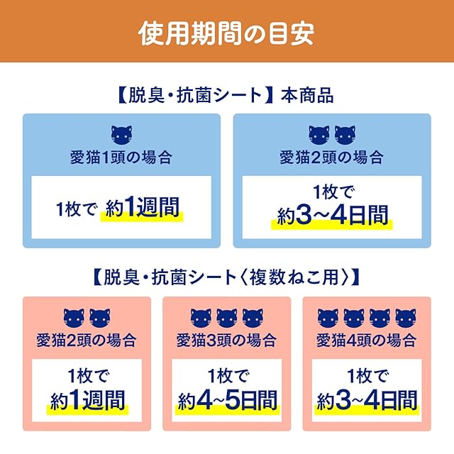1週間取り替えなしでもニオわない!(※1) ※1●チップ、シートによる不快な尿臭の脱臭効果(愛猫1頭に使用する場合)●ウンチをしたときは早く取り除いてください。