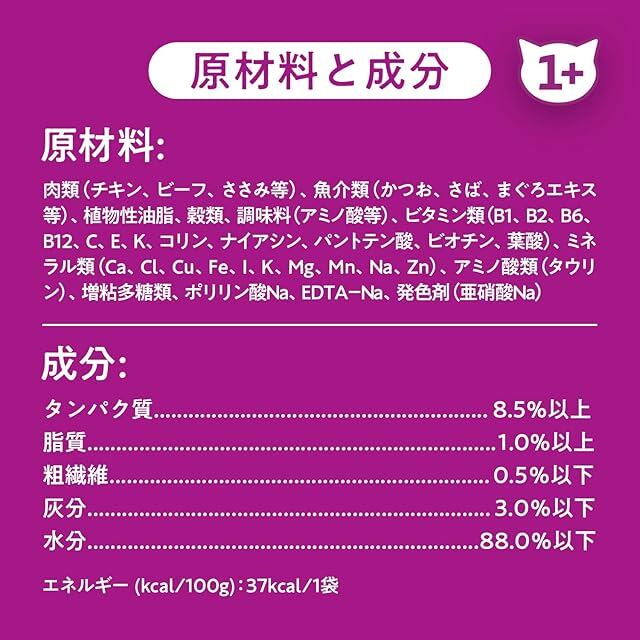 『うまみレシピ』とは、うまみが凝縮されたゼリーに具材をギュッと混ぜ込んだこだわりのレシピ。抜群の味・食感・匂いで愛猫が喜びます。(※ペットフード公正取引協議会が定める愛猫の健康維持に必要な栄養素が全てバランスよく設計されたフードです)