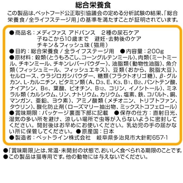 商品名:メディファスアドバンス キャットフード 2種の尿石ケア 子ねこから10歳まで 避妊・去勢後のケア チキン&フィッシュ味 【シュウ酸カルシウム/ストルバイト/国産/お試し】 200g