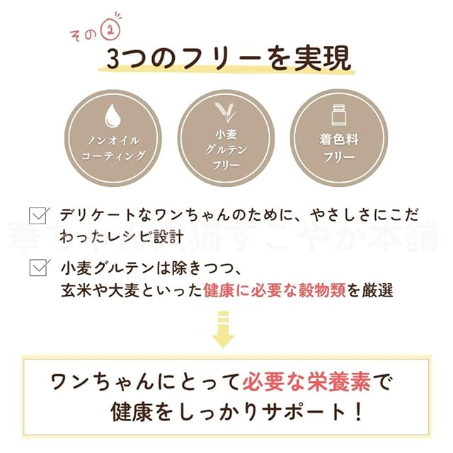 【健康】香料・着色料・オイルコーティング・添加物不使用。 毛並みや皮膚の健康が気になる子にもおすすめ! 関節の健康にグルコサミンとコンドロイチン、整腸にビフィズス菌とオリゴ糖を配合。アルファ化(熱処理し吸収力をUP)した穀物も使用。私たちは、“家族の一員”である愛犬の健康を心から願い、安心・安全で美味しいごはんづくりに取り組んでいます。