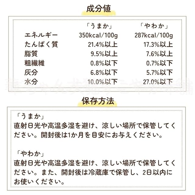 【商品紹介】<br /> 水たき料亭 博多華味鳥が作ったプレミアムな国産ドッグフードです。 人間もおいしく食べられる新鮮な鶏肉である、自社飼育の華味鳥を原材料に100%使いました。安全にこだわり、香料、着色料、オイルコーティングなど一切不使用です。<br /> <br /> 【うまか・やわか原材料】<br /> 鶏肉、玄米、大麦、かつお節、大豆、ビール酵母、チキンエキス、米油、卵黄粉末、発行調味液、フラクトオリゴ糖、りんご、にんじん、かぼちゃ、昆布、しいたけ、コンドロイチン、セレン酵母、しょうが、ビフィズス菌、グルコサミン、L-トレオニン、ミネラル類(牛骨カルシウム、塩化カリウム、塩化ナトリウム、グルコン酸亜鉛、ピロリン酸第二鉄、グルコン銅)、ビタミン類(ビタミンA、ビタミンD、ビタミンE、ビタミンB2、ビタミンB12、パントテン酸カルシウム)<br /> <br /> 【うまか成分値】<br /> エネルギー 350kcal/100g<br /> たんぱく質 21.4%以上<br /> 脂質 9.5%以上<br /> 粗繊維 0.8%以下<br /> 灰分 6.8%以下<br /> 水分 10.0%以下<br /> 【やわか成分値】<br /> エネルギー 287kcal/100g<br /> たんぱく質 17.3%以上<br /> 脂質 7.6%以上<br /> 粗繊維 0.7%以下<br /> 灰分 5.7%以下<br /> 水分 27.0%以下<br /> 【うまか保存方法】 <br /> 高温多湿・直射日光を避けて常温で保管してください。開封後は1ヶ月を目安にお与えください。 <br /> 【やわか保存方法】 <br />高温多湿・直射日光を避けて保管してください。小袋は開封後、冷蔵庫に保管し2日以内に使い切ってください。