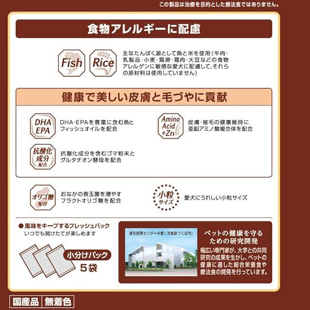 原材料:穀類(米粉、米、米ぬか)、魚介類(フィッシュミール、サーモンミール、フィッシュエキス)、油脂類(動物性油脂、ライスファットカルシウム、フィッシュオイル:DHA・EPA源)、種実類(ゴマ粉末)、糖類(フラクトオリゴ糖)、グルタチオン酵母、シャンピニオンエキス、ビタミン類(A、E、K3、B1、B2、パントテン酸、ナイアシン、B6、葉酸、ビオチン、B12、C、コリン)、ミネラル類(カルシウム、リン、ナトリウム、カリウム、塩素、鉄、コバルト、銅、マンガン、亜鉛アミノ酸複合体、亜鉛、ヨウ素)、酸化防止剤(ローズマリー抽出物、ミックストコフェロール)