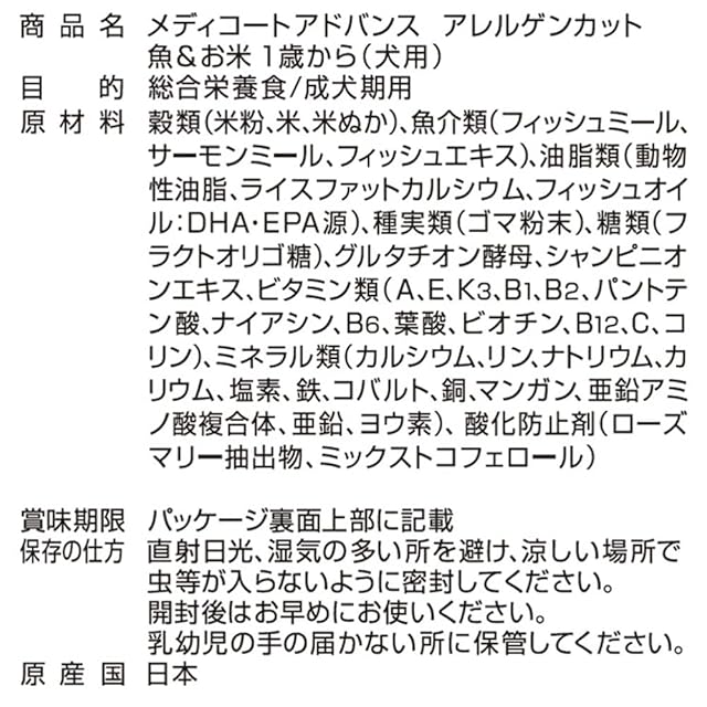 商品名:メディコートアレルゲンカット メディコート アドバンス アレルゲンカット 魚&お米 1歳から【国産/アルミ小分け】 6kg(500g×12)