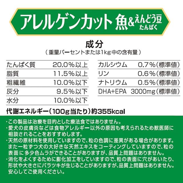 成分:たんぱく質20.0%以上 脂質11.5%以上 粗繊維10.0%以下 灰分9.5%以下 水分10.0%以下