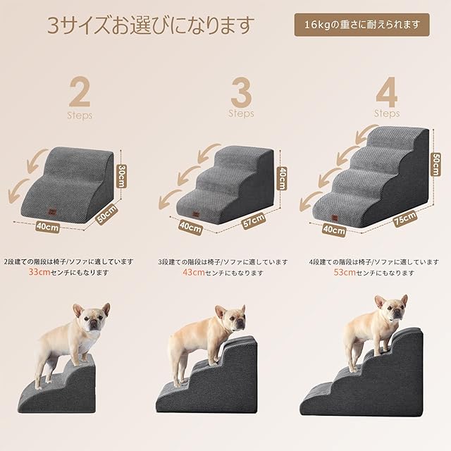 【2つのステップサイズ】この犬用階段には2つのステップと3つのステップがあります。2つのステップは約33センチの椅子/ソファ/ベッドに適しています。3つのステップは約43センチの椅子/ソファ/ベッドに適しています。