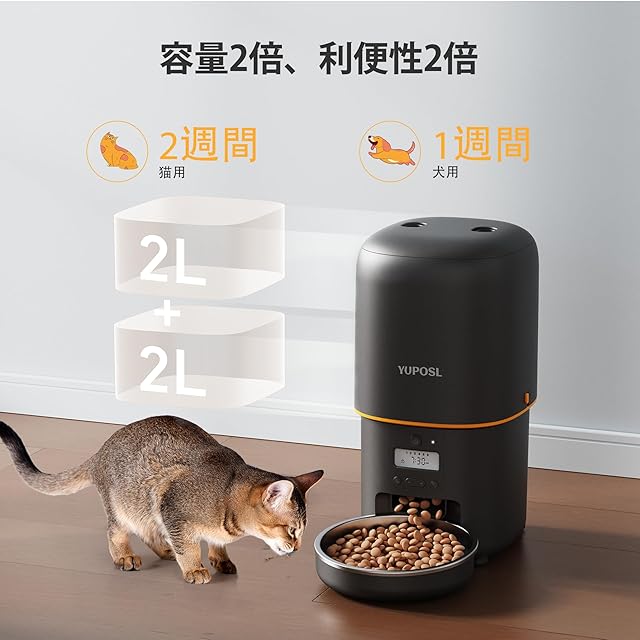 商品名:Yuposl 自動給餌器 犬 猫 1日6食 定時定量 4L容量 自動餌やり機 餌の鮮度保持 2WAY給電 無制限置き場所 水洗い可能 ステンレス製ボウル 手動給餌 タイマー式 設定・お手入れ簡単 ブラック