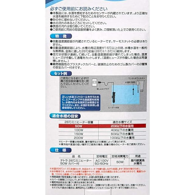 商品名:テトラ (Tetra) ミニヒーター 50W 自動温度調節器内蔵 難燃性プラスチックカバー付き 縦横設置 SP規格適合 観賞魚 金魚 メダカ 水槽