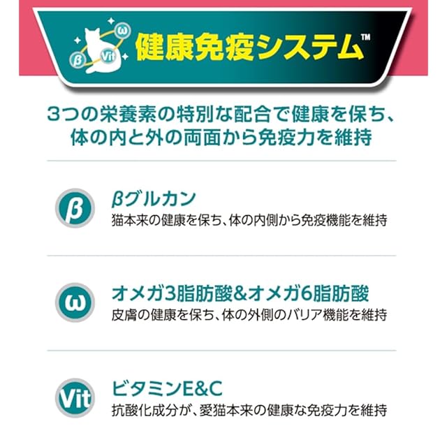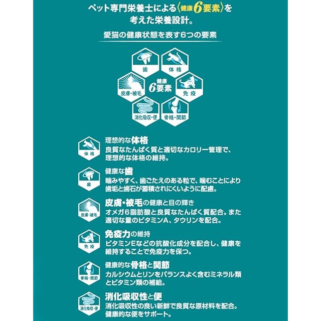 原材料:フィッシュ(サーモン、ツナ)、チキンミール、とうもろこし、とうもろこしたんぱく、小麦たんぱく、米、大豆粉、小麦、鶏脂(オメガ6脂肪酸源)、たんぱく加水分解物、食物繊維、フィッシュミール(オメガ3脂肪酸源)、可溶性食物繊維(オリゴ糖源)、酵母(βグルカン源)、ミネラル類(カルシウム、リン、カリウム、ナトリウム、クロライド、マグネシウム、鉄、銅、マンガン、亜鉛、ヨウ素、セレン)、ビタミン類(A、D、E、K、B1、B2、パントテン酸、ナイアシン、B6、葉酸、ビオチン、B12、コリン、C)、アミノ酸類(メチオニン、タウリン)、カラメル色素