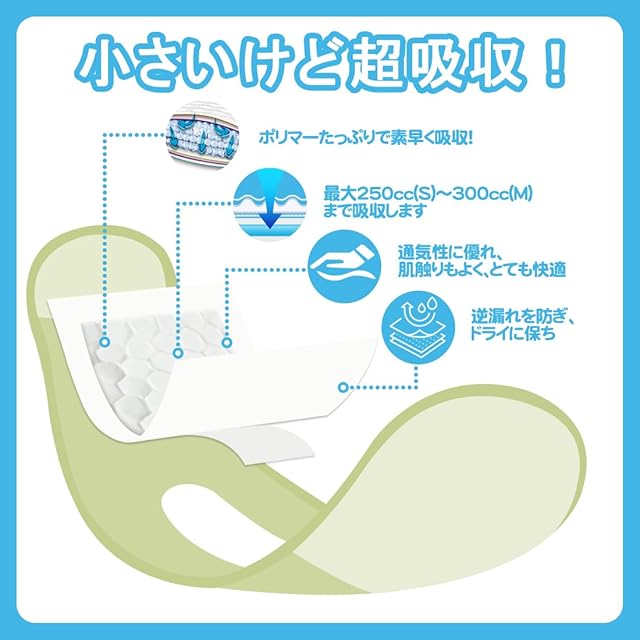 【しっかりとした吸収力】弊社のマナーパッドは瞬時におしっこを吸収します、他のマナーパッドより多く吸収し、S号は約250cc、M号は約300ccまで吸収します。