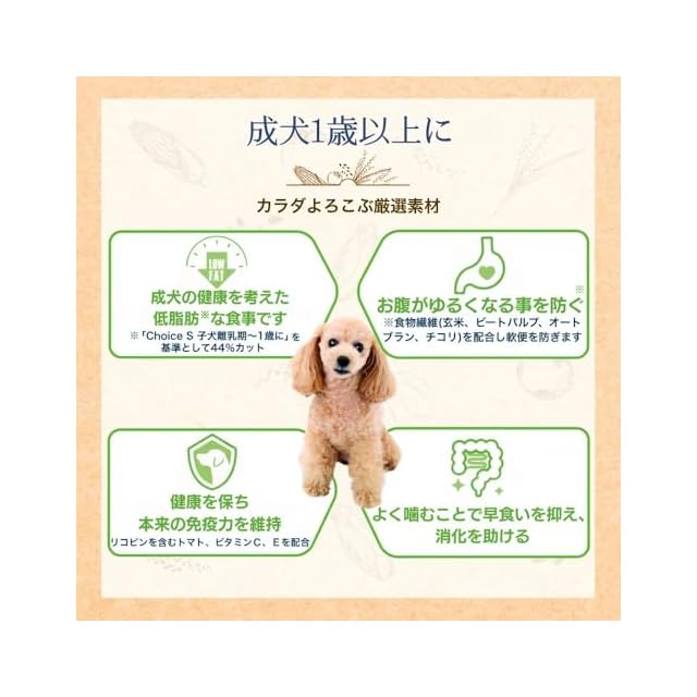 ・成犬の健康を考えた低脂肪な食事です(「ChoiceS子犬離乳期~1歳に」を基準として44%カット)。