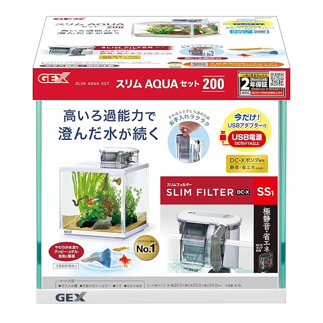 GEX AQUARIUM スリムアクアセット200 DC-Xポンプ採用スリムフィルター付き ガラス 水槽 観賞魚飼育 2年ホワイトフレーム水槽 W20×D20×H20cm 約6L