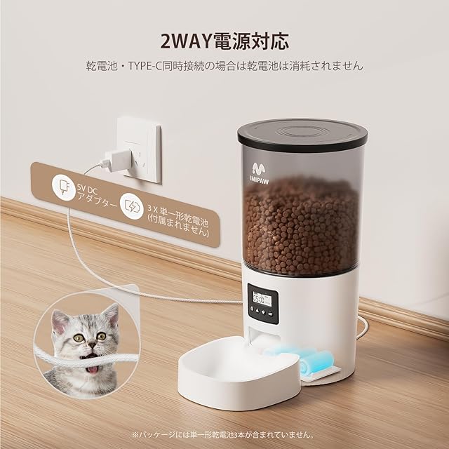 商品名:IMIPAW 自動給餌器 猫 【2025新モデル】タイマー式 給餌器 5L容量 2WAY給電 手動給餌 自動餌やり機 手動給餌 設定・お手入れ簡単 1日6食 ホワイト
