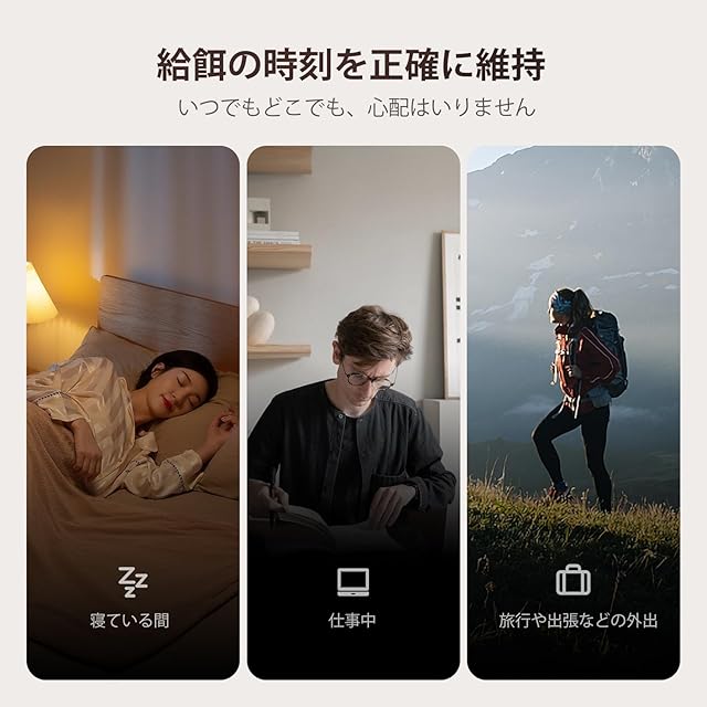 獣医師監修の「1日6回までの分割給餌」で肥満・糖尿病リスクを軽減。5g〜100g単位で正確な食事量をキープします。 停電対策のプロ仕様 AC電源+単1電池3本(別売)の2WAY給電を採用。地震大国でも安心の防災対応設計が特長。電源切れても設定はそのまま! 30秒自動ロックで誤操作防止 タッチパネルは無操作時自動でロック。賢い猫のイタズラもブロック。 静音設計でストレスフリー 給餌音25dB以下(業界平均35dB)。神経質な猫も驚かない 別仕様パッケージ内容 本体 ×1、分離式フードトレイ ×1、日本語マニュアル ×1、ACアダプター・ケーブル(噛みつみ対策済み)×1 ※ 単1アルカリ電池は付属しません