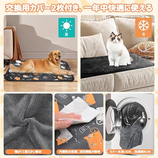 【丸洗い可能・2色交換カバー|季節に合わせて快適をコントロール】 ペット用電気毛布は高品質な水晶マイクロファイバーを使用したカバーは洗濯機で丸洗い可能。ブラウンとグレーの2色の柔らかいコーデュロイカバーが付属しており、清潔とインテリア性を保てます。ペットヒーター本体は防水・防汚加工のため、拭くだけの簡単お手入れ。夏はカバーを外してひんやりマットとして使えるなど、季節に応じて使い分けが可能。あらゆる犬小屋やケージにフィットし、愛犬・愛猫の一年中の快適さをサポートします。