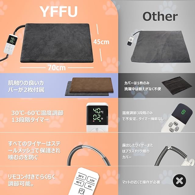 商品名:YFFU ペット用ホットカーペット【2025年新開発ペット専用コントローラー付き・ペット専門家チーム監修】ペットヒーター 犬 猫用 ヒーター 30~60℃温度調節 1H~24Hタイマー 両面発熱・60秒速暖・恒温機能・過熱保護・噛み癖対策・メモリー機能 難燃性 IP67防水 PES認証 ペット 電気ヒーター カバー2枚洗濯可 ペット加熱パッド (70x45cm・業界初リモコン付きモデル)