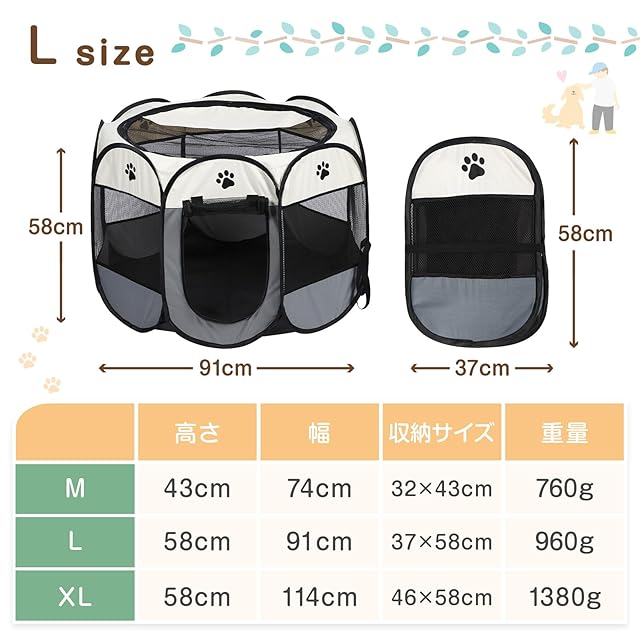 商品名:HinaHima 折りたたみ式 ペットサークル 収納バッグ付き 組み立て不要 猫 犬用 ケージ 幅91cm×高さ58cm (L, ブルー)